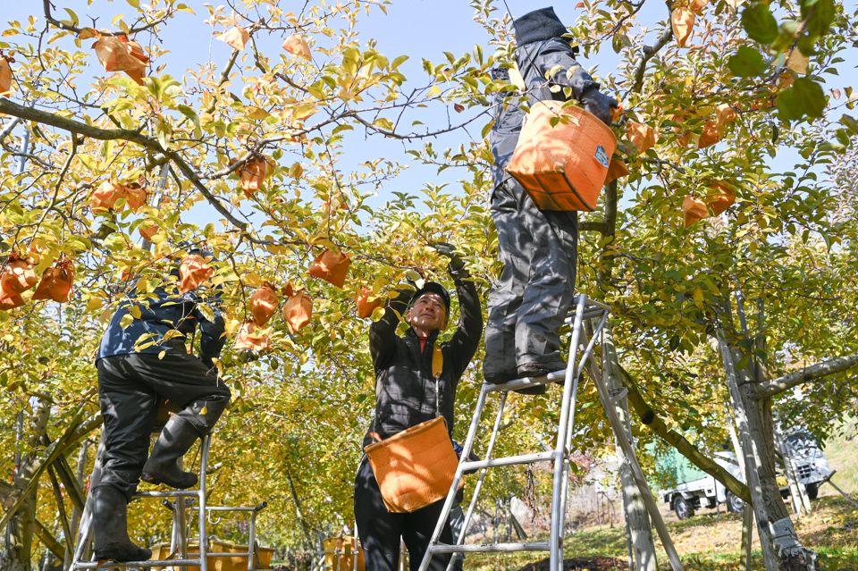 雪の残る冬の剪定作業から始まり、薬剤散布に草刈り、花が咲いてからは受粉作業、実が付き過ぎないように摘果も行い、品種によってはひとつひとつ袋をかけたり、太陽に当たるよう実を回したり…。